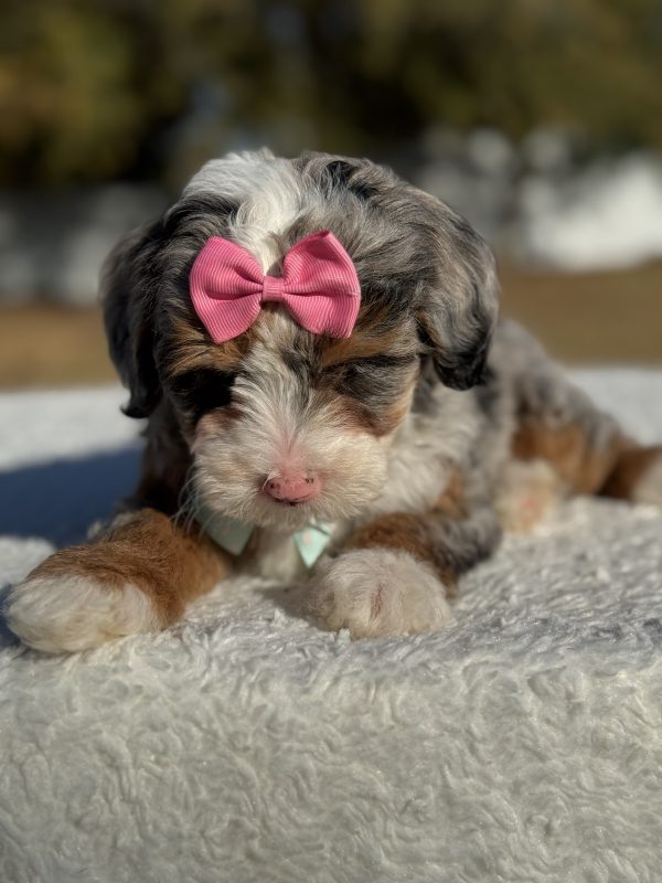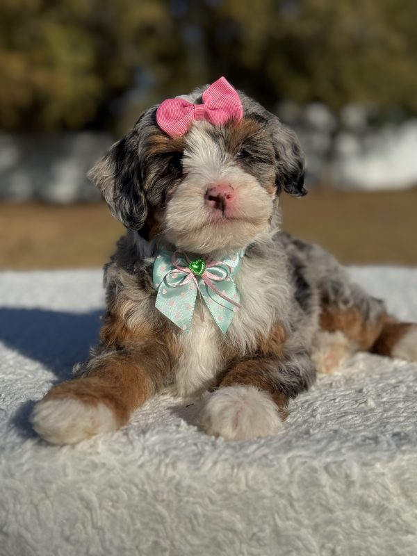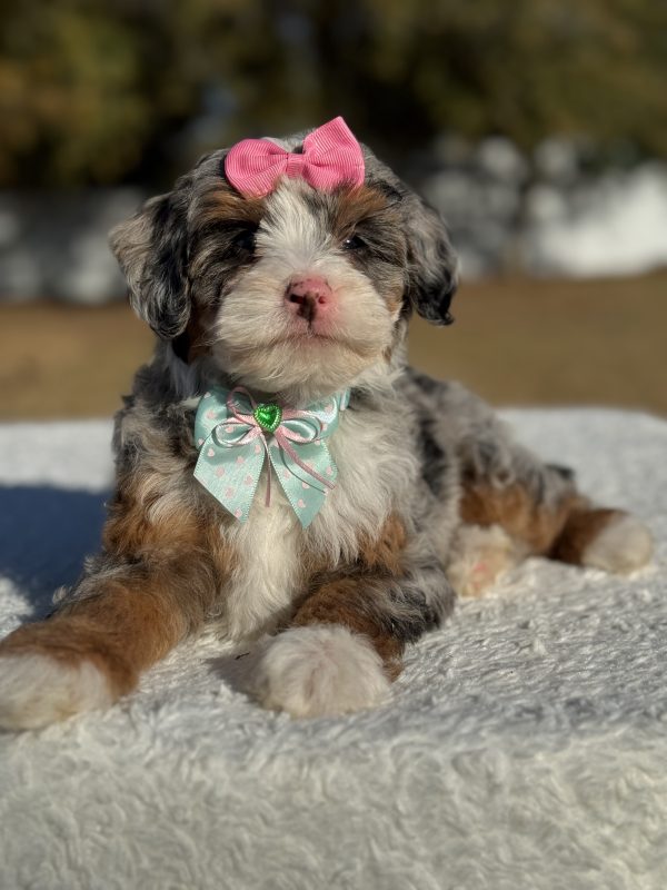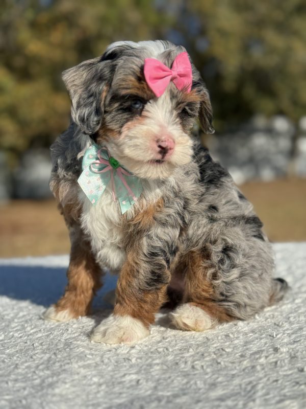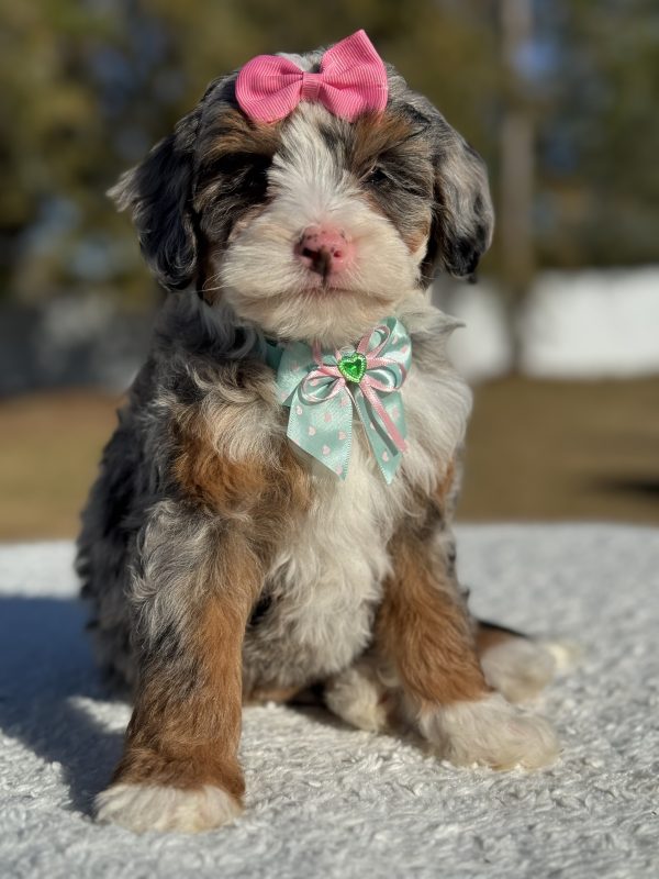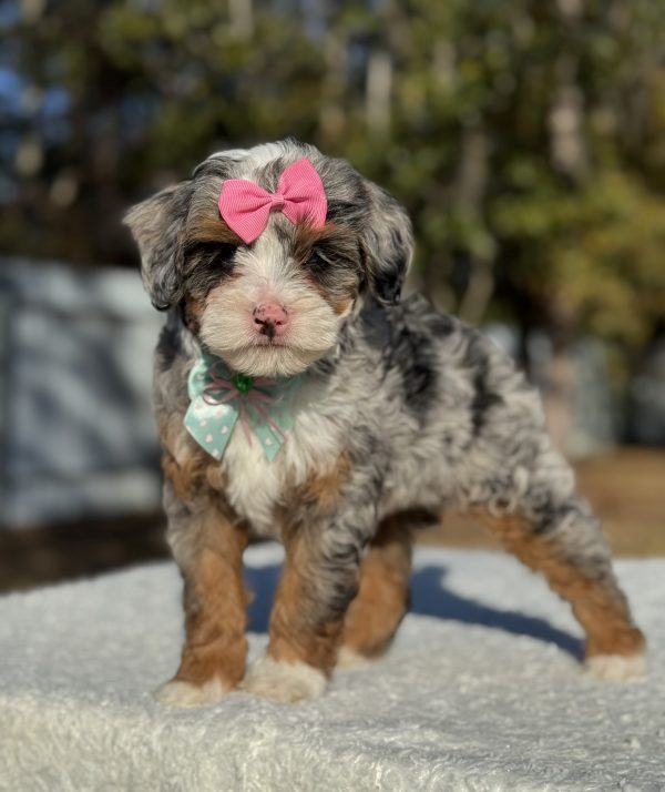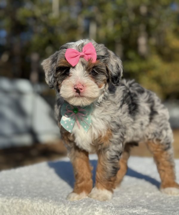 Amaya’s merle coat is striking and unique, but what truly sets her apart is her temperament. Bernedoodles are known for their loyalty, intelligence, and loving nature — a combination that makes them exceptional lifelong companions.