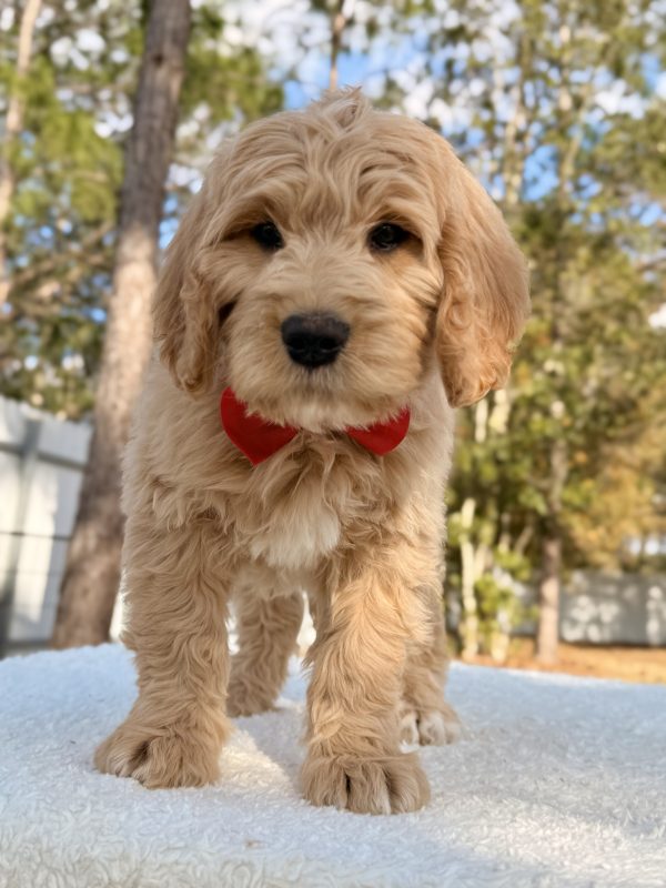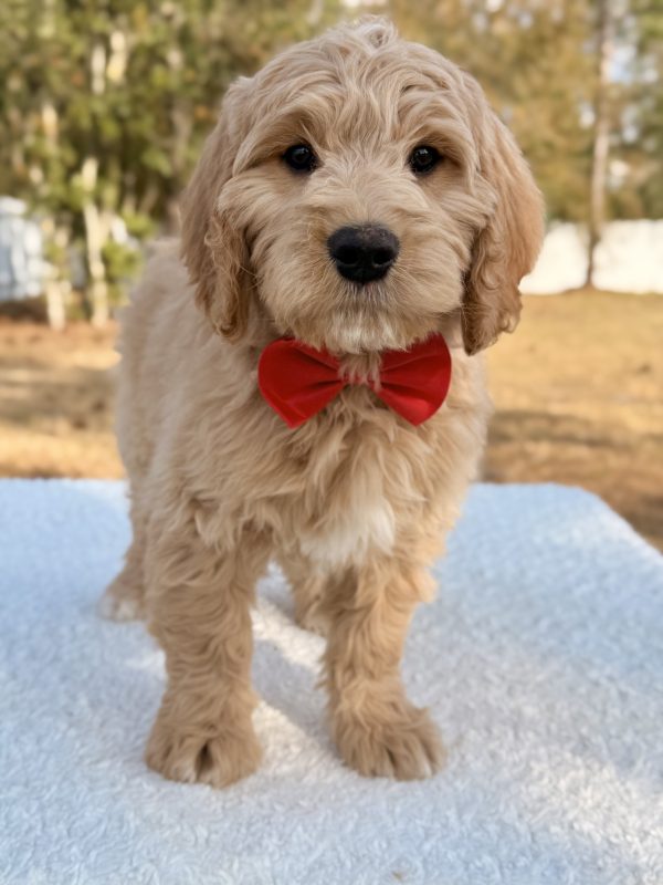 Meet Xiomar, a handsome F1 Standard Goldendoodle with a loving personality and an adorable teddy-bear look. He combines the loyalty of a Golden Retriever with the intelligence of a Poodle, making him an amazing companion for families or active homes looking for a devoted best friend.