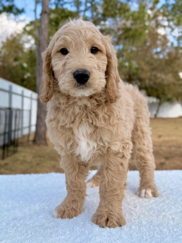 Meet Xayden, a handsome F1 Standard Goldendoodle with a loving personality and an adorable teddy-bear look. He combines the loyalty of a Golden Retriever with the intelligence of a Poodle, making him a perfect companion for families or active homes looking for a devoted best friend.